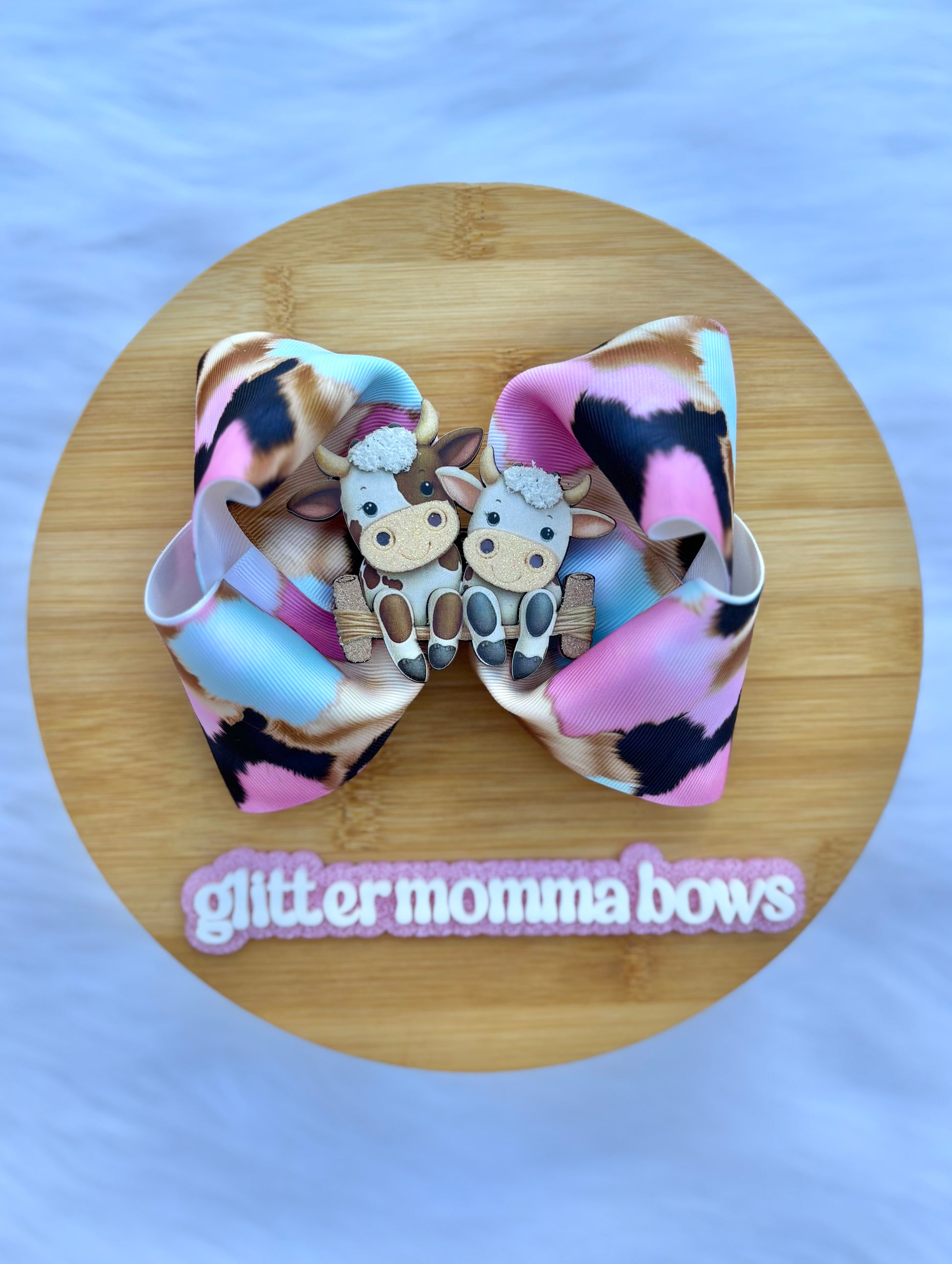 This adorable cow bow features two sweet little cows snuggled together on a mix of pastel and cow print ribbon ā the cutest combo of country charm and girly fun! Perfect for everyday wear, farm days, or adorable photo shoots.