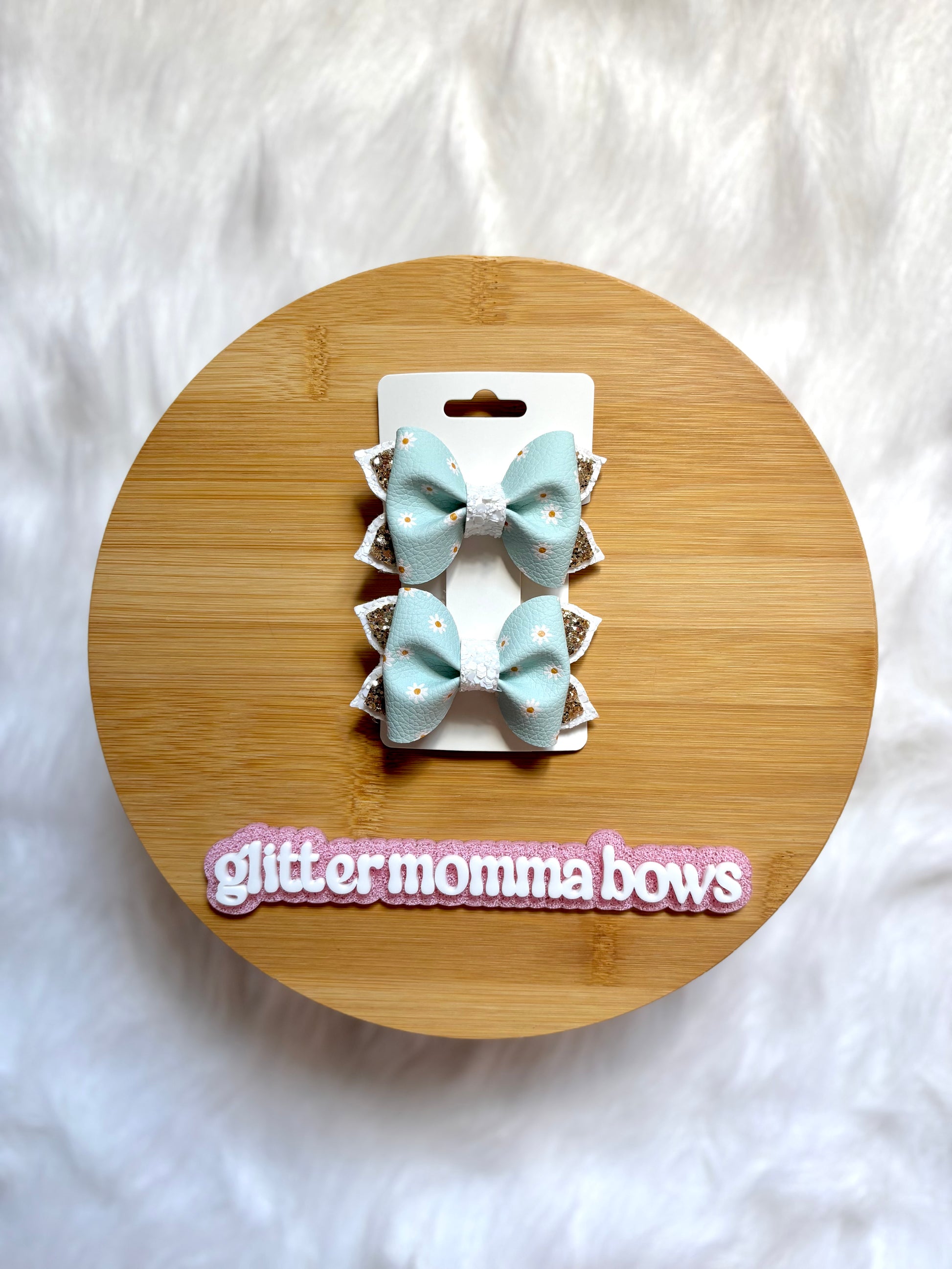 3" daisy piggies light blue, white, and gold printed bow