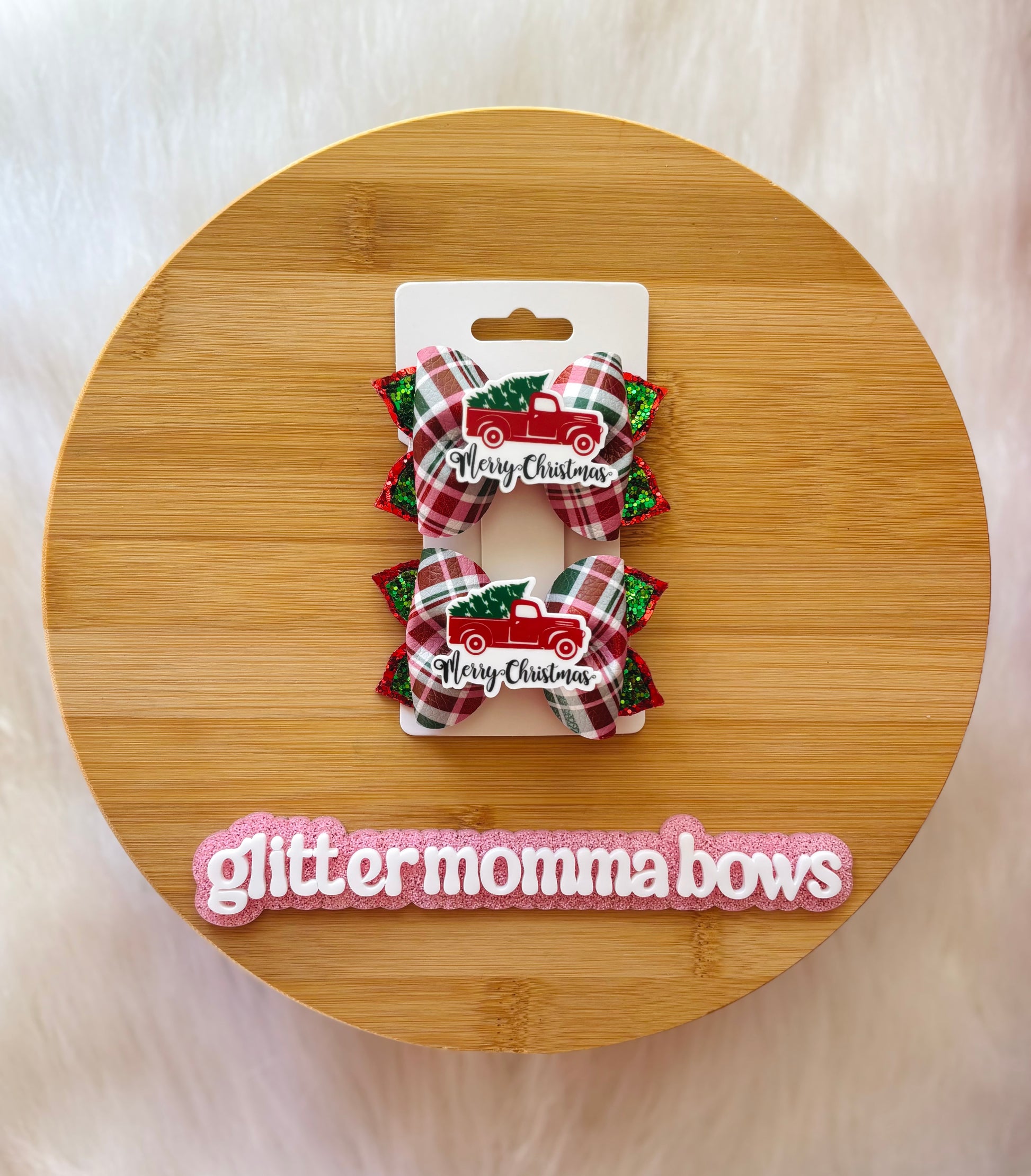 Get ready to sleigh the season with these adorable Christmas piggies! Each bow features a festive red plaid print, sparkly green glitter layers, and the cutest little red truck hauling a Christmas tree. Perfect for pigtails, holiday parties, or matching with your mini for all those festive photos!